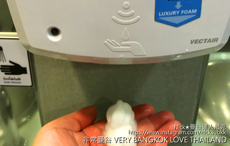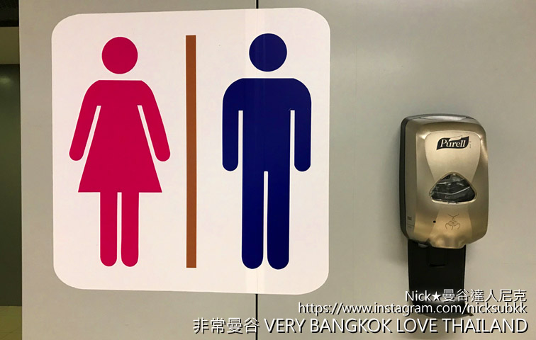 在泰國機場遊客會使用到的洗手間入口,除了有自動感應的洗手泡沫、自動感應水龍頭(避免接觸、泰國機場真的先進許多)之外,還在入口設有Purell品牌的酒精乾洗手。