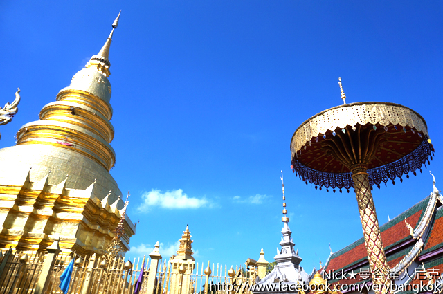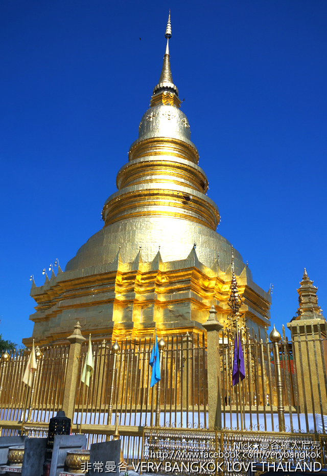 寺內最為知名的哈里奔猜金色佛塔,和雙龍寺看起來有點像!哈里奔猜佛塔是蘭納式鍾型貼金造型,佛塔底座為三層四方形的塔基。
