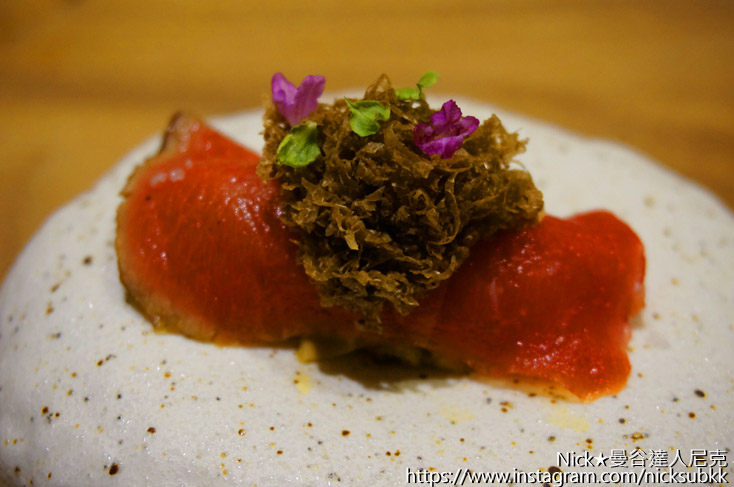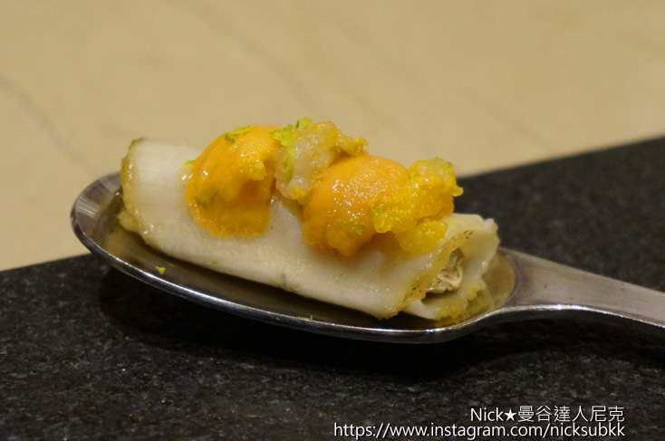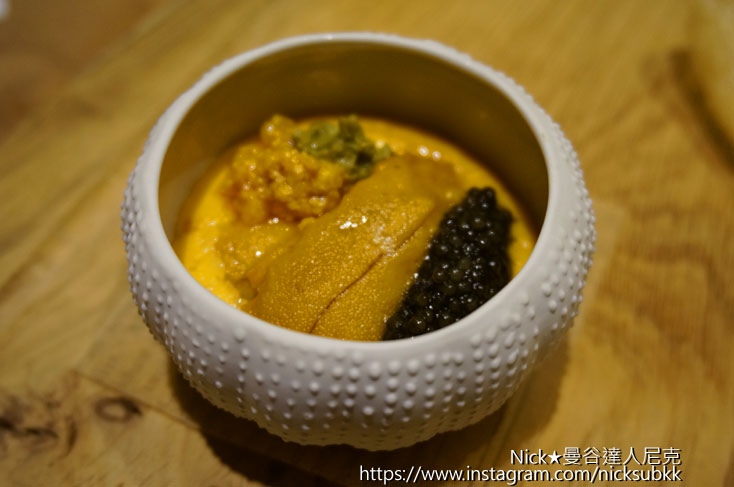 松露炒蛋搭配新鮮海膽及大閘蟹膏,無論單吃或佐以壽司飯做的米餅搭配入口,頂級食材香氣及口感的完美交融,令人無法忘懷。