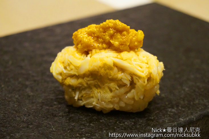一絲絲鮮甜的大閘蟹蟹肉與濃稠的蟹膏搭配壽司飯,成爲世界上最令人驚喜的握壽司。