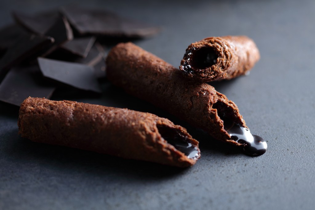 品嘗「醇黑真巧蛋捲」入口時,會先品嚐到帶有巧克力塊的香甜酥脆可可餅皮,透過可可亞醇厚香氣滿足嗅覺感官,再結合真實巧克力的黑巧薄餡,越是咀嚼,越能體會巧克力交織出的完美苦甜滋味,滿足味蕾欲望,為台灣首創、名副其實的「真」巧克力蛋捲。