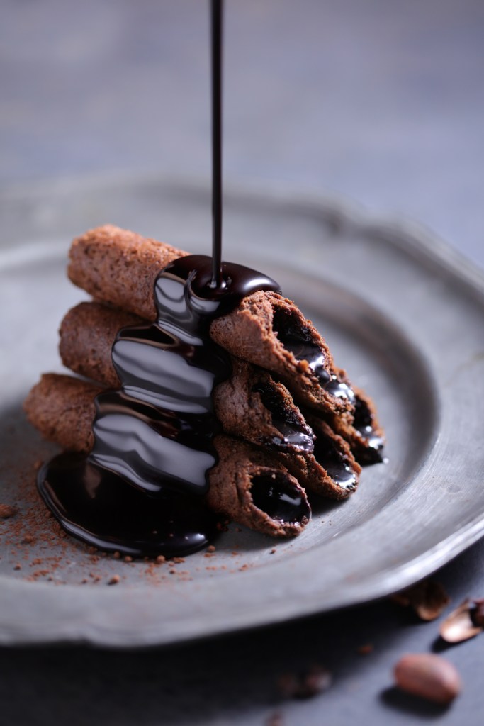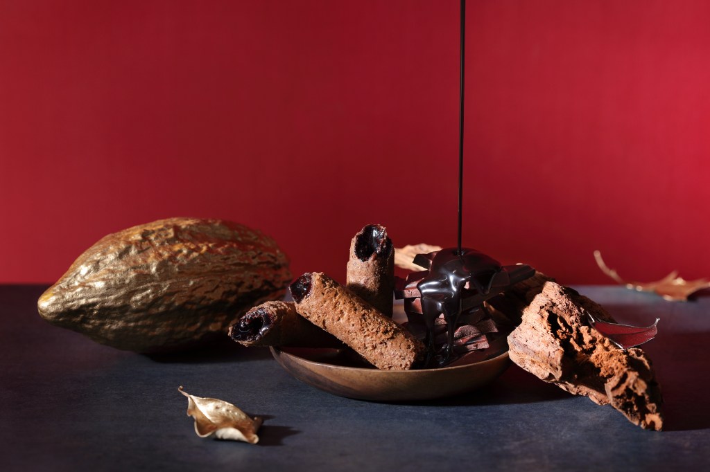 有別於市面上常見的可可空心蛋捲,「青鳥旅行」運用獨家技術製作這款醇黑真巧蛋捲,在其內圈圈上一層巧克力,充分凸顯濃醇馥郁的可可風味並確保整個蛋捲的比例甜而不膩,不讓厚重的巧克力餡帶走原本蛋捲的韻味。