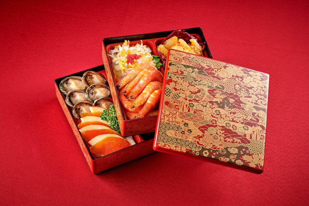 如果想念日式氛圍,不妨考慮「江南春」主廚「劉宜嘉」推出的超美限定單點「鴻運八寶福拼盤-日本漆器盒」/ NT$1,888,兩層漆器包含著紹興醉鮮蝦、麻辣牛筋、涼拌花膠片、櫻桃鴨胸、魚子醬墨魚、烤野生烏魚子、鹽焗黃金雞、五味九孔等年節美味。