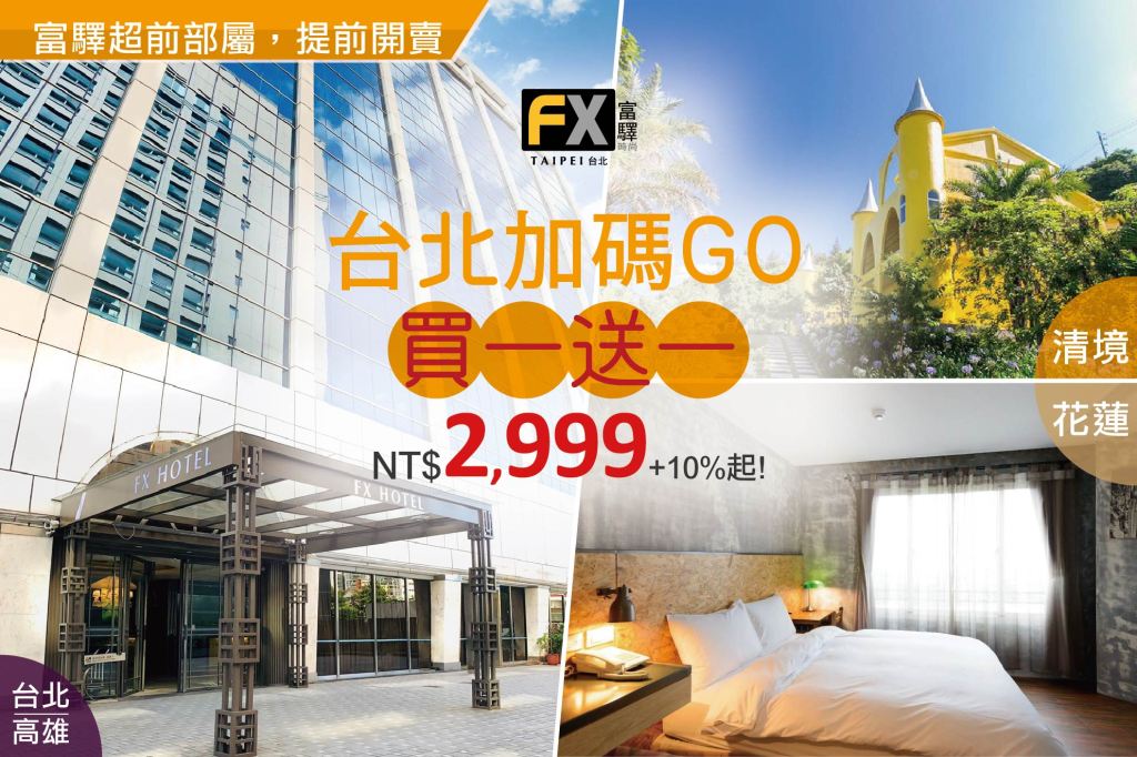 日前台北市政府宣布推出「台北加碼GO」安心旅遊3.0補助,台北富驛時尚酒店(FX HOTEL TAIPEI)計畫提前「台北加碼Go」買一送一,搶訂優惠週日~週四入住雙人房2999+10%起!最高可折抵NT$1,000以外,還搭配FX旅宿家聯盟酒店五選一(平日雙人房乙晚),極為超值!