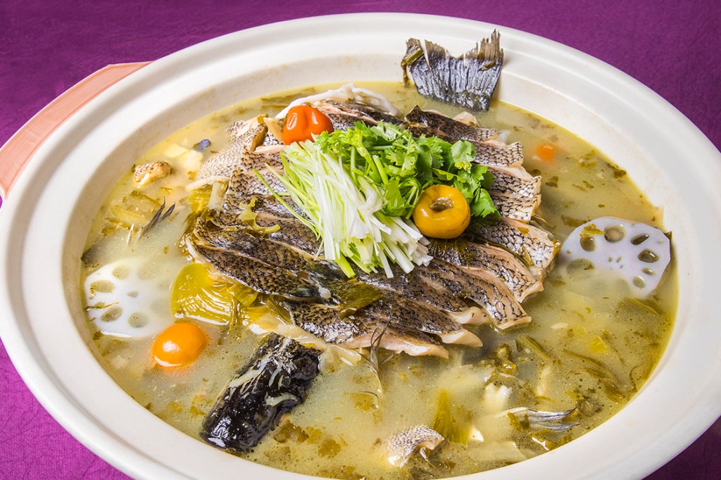 牛年全家圍爐的最強湯品「家宴農家酸菜魚」,主廚將宜蘭的高山泉鱸魚以及關西北埔客家酸菜,放入熬煮8小時的高湯中,並融合傳統川菜料理手法,讓鮮嫩魚肉細膩地吸收酸菜、泡薑,再加入川菜之魂-藤椒油,酸菜香氣撲鼻,伴隨微麻口感,讓人口水直流!