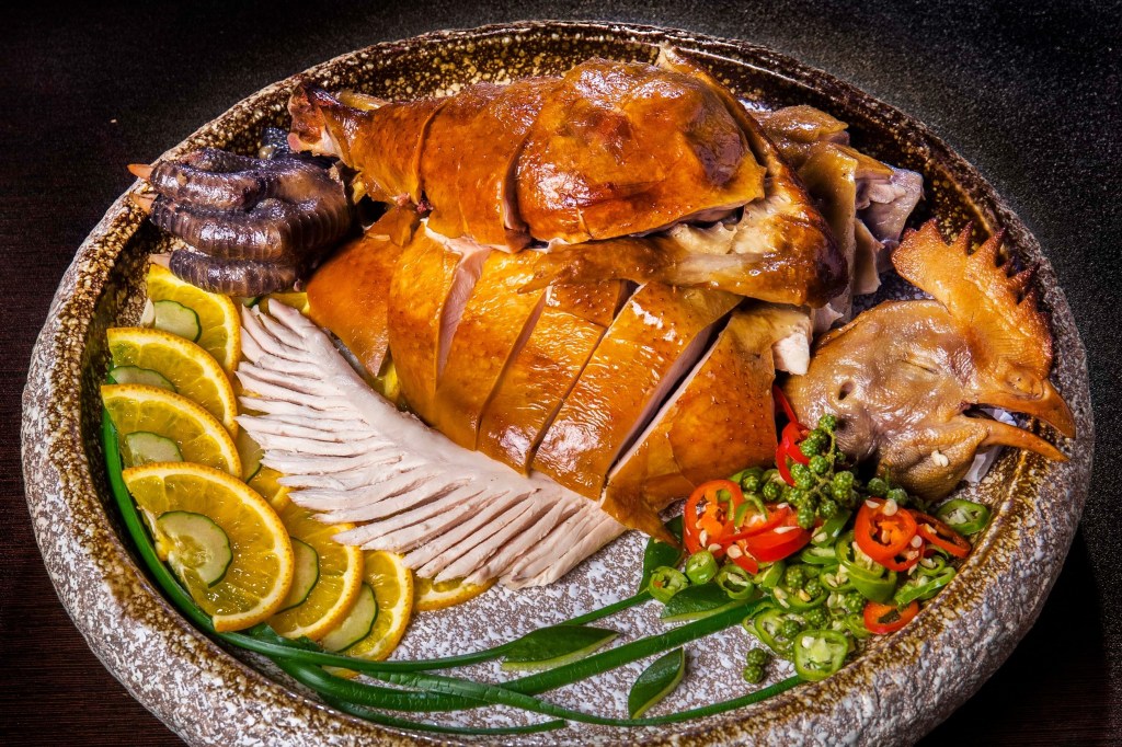 這一道「青花椒魚露雞」是將雞肉放進主廚自製潮式滷水中,低溫浸泡熟成,以上等大紅袍花椒醬汁與藤椒油交替澆淋,辛香四溢,再鋪上新鮮青花椒串,入口後麻中帶香,讓人一口接一口欲罷不能。