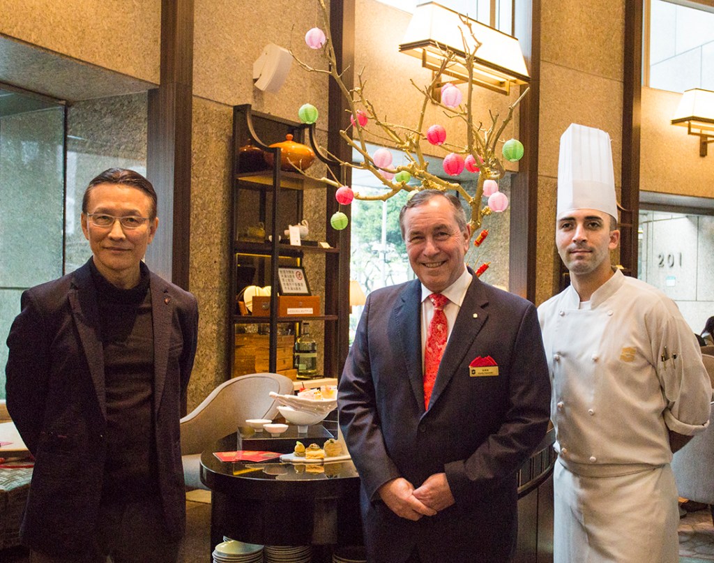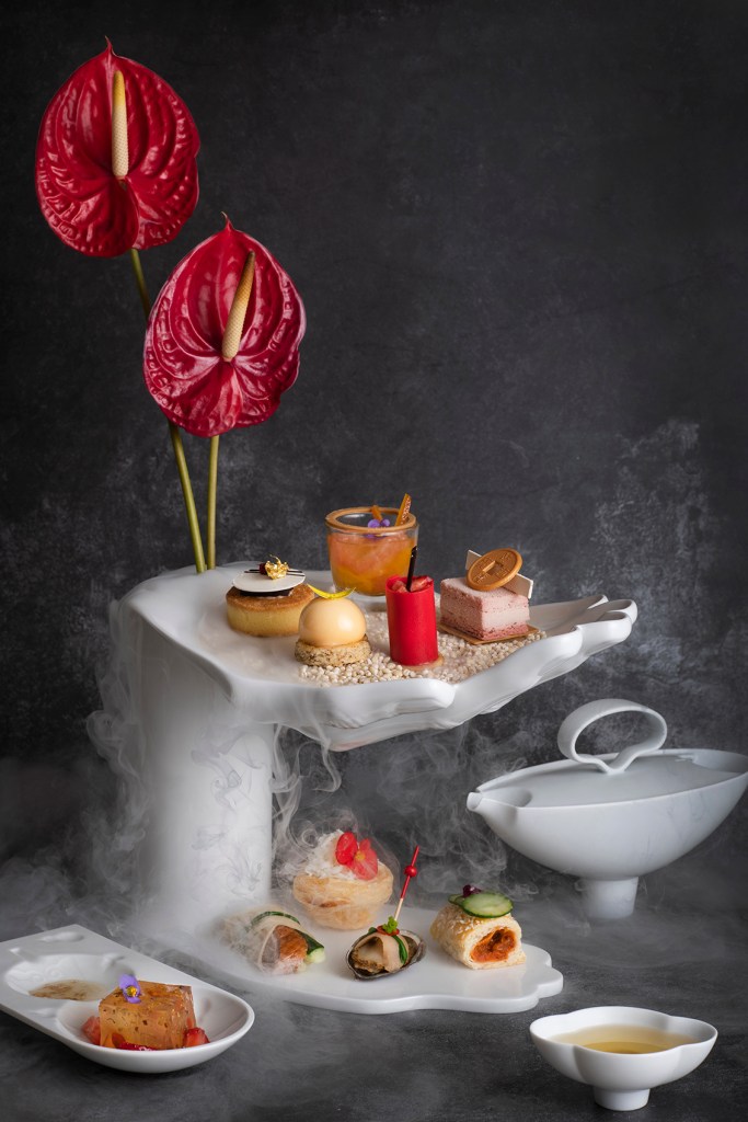 期間限定的「新氣下午茶」,特別選用八方新氣的「托福」作為下午茶架,外型以象徵虔誠和平的手,溫柔地向上托起滿滿的福氣,也提醒著每個人在悠閒享用下午茶的同時,更要懂得感恩惜福。最特別的是,這件瓷器作品的手臂巧妙設計成花器,多功能的創意與運用,正是八方新氣設計的主要特色,以不設限的想像力打造生活美學。搭配「托福」造型,甜點行政主廚法蘭克將新春意象融入其中,例如爆竹、金元寶等,共有六款甜點與四款鹹點,十全十美道道精巧,口味上也融合中西,讓人驚喜連連,賓客選用下午茶的咖啡或茶,也可親自體驗多款八方新氣精選茶具。其中「紅寶石牛奶巧克力蛋糕佐杏仁達茲瓦克」這道浪漫粉色甜點的蛋糕主體是使用夢幻的紅寶石巧克力(Ruby Chocolate),產量稀有,入口綿密柔順,帶有莓果酸甜口感,主廚也運用近年來深受歡迎的法式點心「達克瓦茲」作為夾層,外酥內軟的口感很有層次感,甜點上再以古代銅錢造型巧克力作為點綴,象徵新的一年鴻圖大展、財源廣進;「橘香奶油漬金桔布朗尼」酸甜有味,第一層滋味來自橘子白巧克力的柑橘香甜,接著來自經典美式布朗尼與甜漬橘子皮的果香甜味,交融成不同層次的味覺體驗;「草莓慕斯開心果費南雪」主廚創意設計充滿年節童趣的紅色爆竹,以酸甜的草莓慕斯,外層裹著紅寶石巧克力,使其呈現新春氣息的深紅色!
