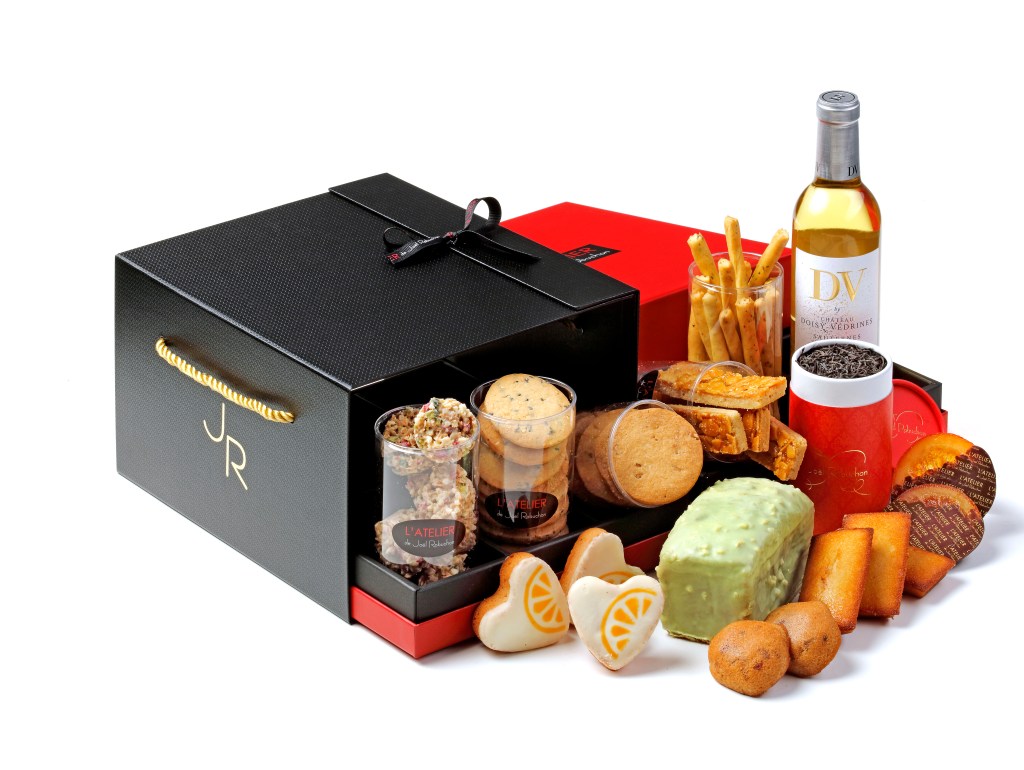 侯布雄新年團圓禮盒 (NT$4,260),包含法國索甸貴腐酒、海鹽堅果沙布雷、芝麻沙布雷、白巧克力脆球、佛羅倫丁、開心果櫻桃磅蛋糕、卡堤塔尼茶、橘片巧克力、栗子瑪德蓮、柑橘瑪德蓮、費南雪、普羅旺斯格西尼。(尼克貼心提醒:未成年請勿飲酒)