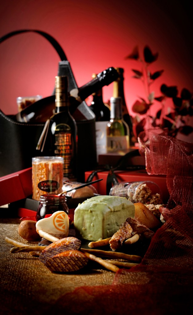 侯布雄新年禮籃組 (NT$8,280),包含佛羅倫丁、甜酥棒、費南雪、全麥沙布雷、抹茶沙布雷、芝麻沙布雷、柑橘瑪德蓮、栗子瑪德蓮、白巧克力脆球、松露格西尼、橘片巧克力、四種莓果醬、開心果櫻桃磅蛋糕、卡堤塔尼茶、侯布雄精選橄欖油(西班牙進口)、法國凱歌皇室香檳(Veuve Clicquot)。(尼克貼心提醒:未成年請勿飲酒)