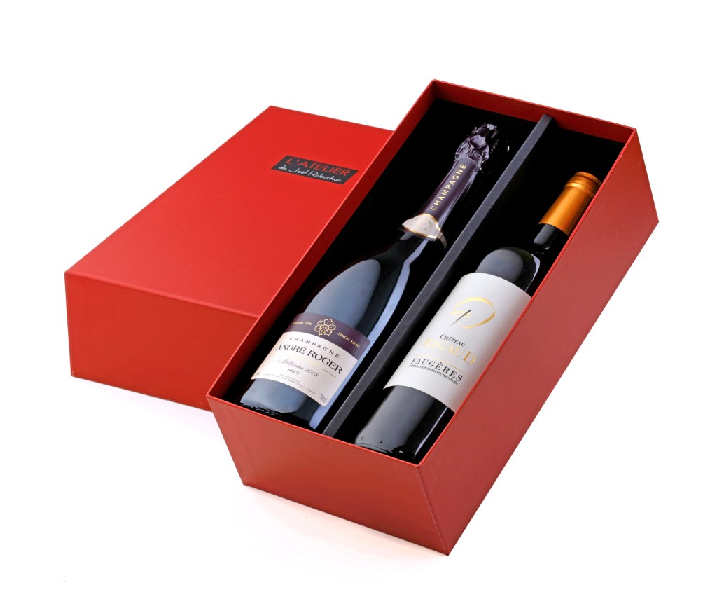新年酒禮組 優惠價NT$3,680 (原價NT$5,200) ,最適合送給品酒人士,包含2014 Château Rigaud Faugères、2008 Champagne Grand Cru André Roger香檳。(尼克貼心提醒:未成年請勿飲酒)