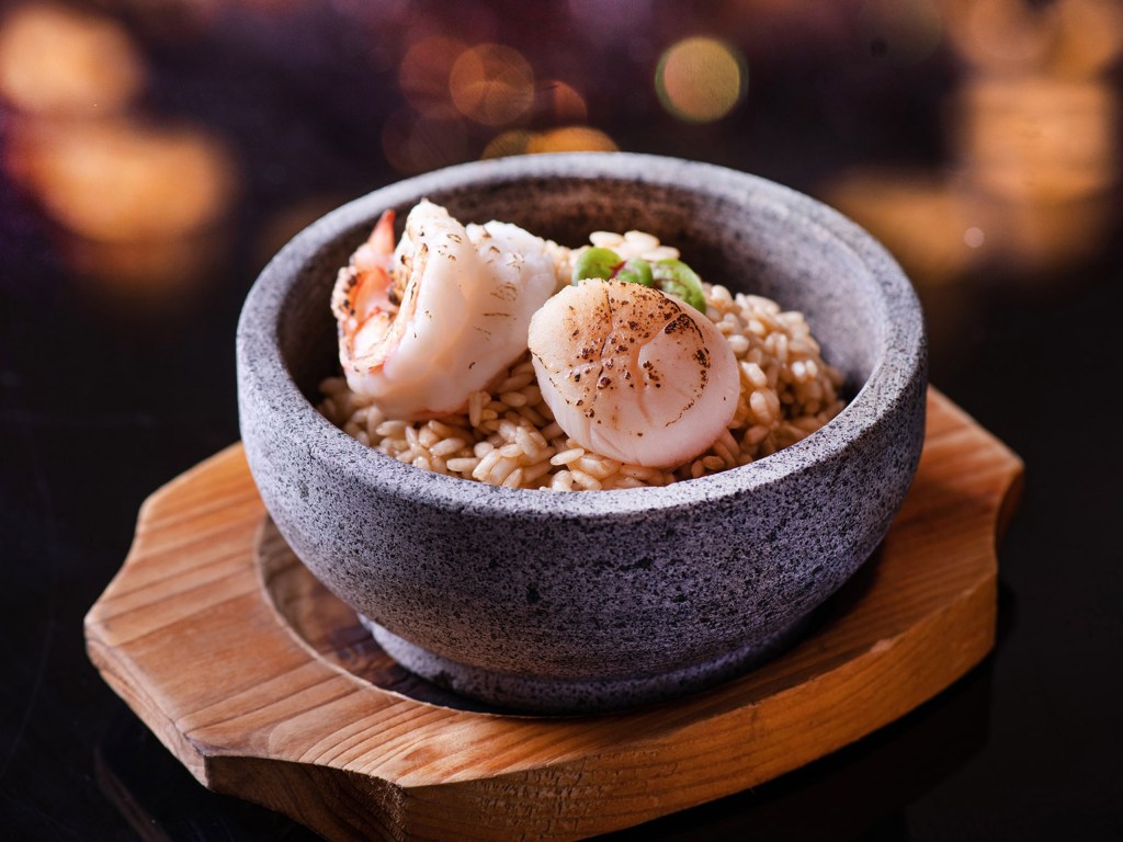 「石鍋蝦湯燉飯」色澤金黃的米粒,實則是以大量蝦頭新鮮熬製的蝦湯煨煮,使用義大利米結構結實,保留米心微硬彈牙,整體濃稠粉感質地,放上鮮甜的日本生食級干貝、明蝦,口口蝦味濃厚,上桌以石鍋盛裝熱氣四溢,記得趁熱拌開、立即享用醇厚美味。