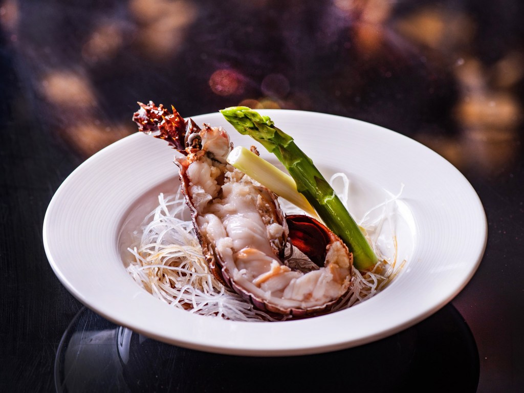 重點菜品「清蒸龍蝦」,選用市面上少見的珍珠龍蝦,個頭雖小,甜度高、肉質爽脆,只以魚露簡單調味清蒸,活體烹調吃得到新鮮海味,鋪墊的細絲粉條充分吸收鮮味。