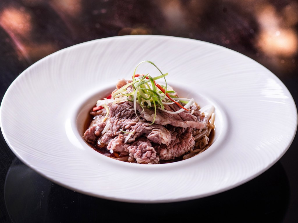 「白灼雪花牛襯時蔬」特選美國無骨牛小排,大火滾水川燙淋上魚露、生抽搭配豆芽、金針菇,吃來肉質軟嫩,清爽卻又鹹香夠味,絕對驚喜。