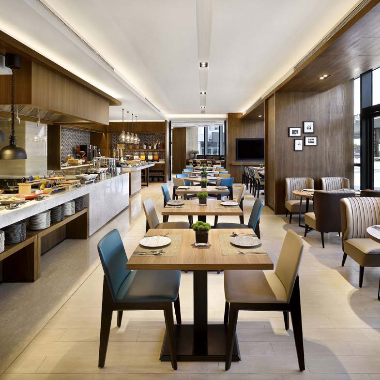 酒店內的「The Dining Room」楓橋餐廳以開放式廚房概念為設計,提供豐富多樣的自助式早餐,與特色國際與亞洲料理午晚餐單點菜單;2021年成為全台第一間有「星巴克咖啡服務自助吧」進駐的酒店,每天提供新鮮濃縮烘焙咖啡豆所製成的飲品,24小時供酒店商務客與休閒旅客購買及品嚐高質量的「星」級咖啡;全新餐點由主廚黃兆銓發想,加入中部的特色食材,如麻薏、大甲芋頭等。麻薏是黃麻的嫩葉,台中老一輩的人夏天煮麻芛湯,手工去除根莖,將嫩葉搓揉去苦水煮製而成湯,清火消暑,隨著時代更迭,季節限定的麻薏湯已經逐漸消逝在餐桌上。這次師傅特將麻薏磨成粉相融奶油起司製成甜點,綿密的口感交織出乳酪與淡淡的麻薏風味。