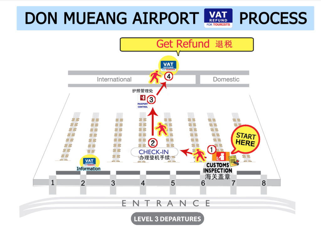 - 旅客可以直接申請退稅,在國際機場的VAT REFUND FOR TOURISTS COUNTER或將所有的文件資料寄給THE REVENUE DEPARTMENT OF THAILAND。