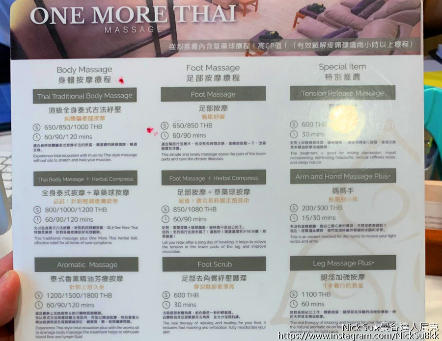 ▲One More Thai Massage泰式按摩的價格表,《Bangkok FunPASS 好好玩曼谷護照》 提供的是60分鐘頂級全身泰式古法舒壓(不可以更換內容)!