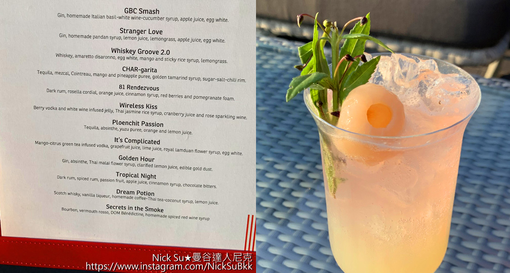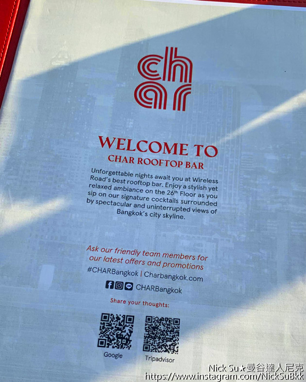 ▲這是《Bangkok FunPASS 好好玩曼谷護照》 提供的飲料選單,可以任選一杯創意雞尾酒,如果不喝酒的人也可以選擇沒有含酒精雞尾酒(MOCKTAIL)的飲料。尼克這一次是預定傍晚17:00來CHAR,太陽仍然非常大很熱,如果想要前來這裡,建議預約18:00的時段或是晚上來這邊會比較合適喔。