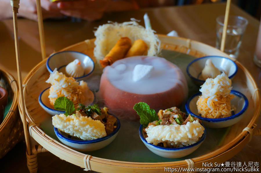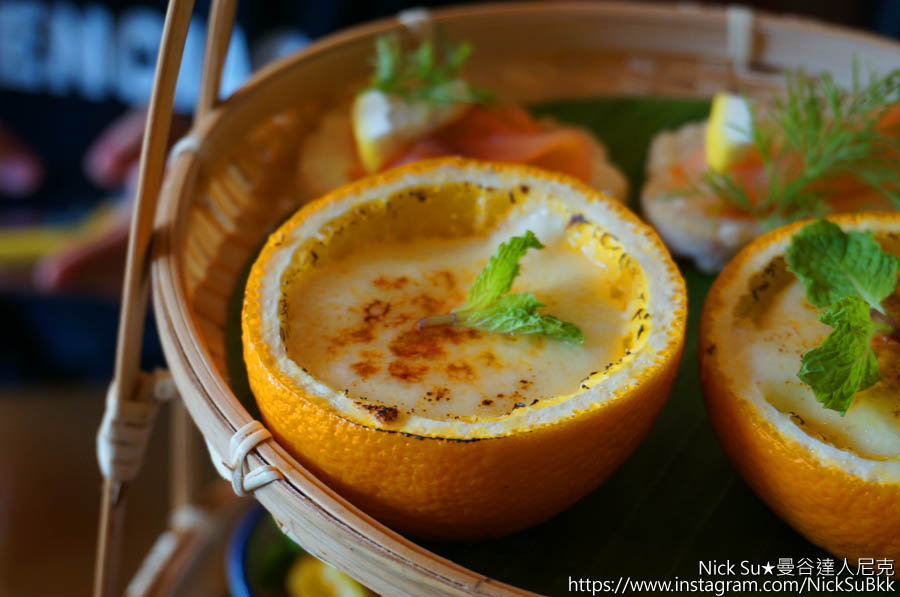 ▲英迪格酒店 2樓 的Metro on Wireless 餐廳泰式風格下午茶,以泰國竹編呈現三層泰國傳統下午茶,這一層是鹹點中間還有乾冰裝飾,好拍又好吃。