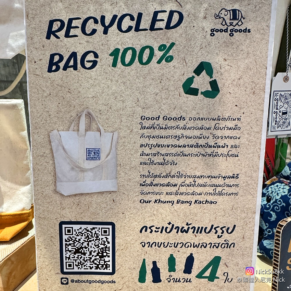 這一款環保購物袋是由四個Recycle回收而來的保特瓶所製成,將廢料寶特瓶轉化而成為織物,並製作出實用的購物袋。同時只要購買此款「good goods」環保購物袋,扣除成本費用後的收入會捐給廢棄物管理環保基金會,一同為地球環保盡份心力,是不是很棒呢?