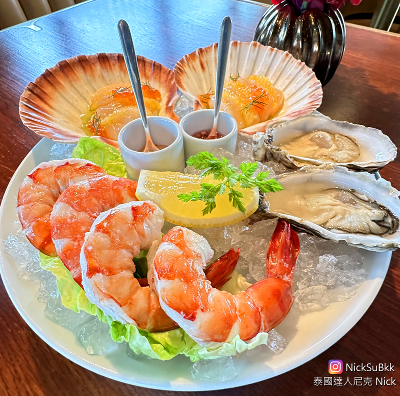 前菜包括法國生蠔、泰國老虎蝦、日本北海道干貝冷盤,以及法式肉餅、松露布里芝士、凱薩沙拉和來自泰國考艾(Khao Yai)十分美味的布拉塔芝士配傳統番茄(Khao Yai burrata with heirloom tomato)。