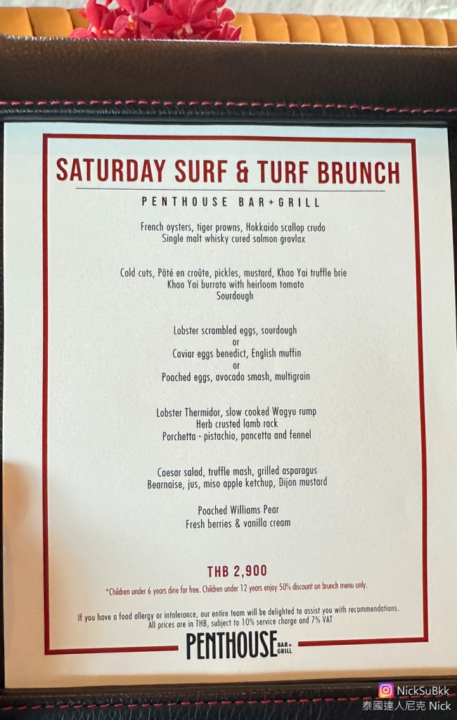 星期六限定的海鮮牛排早午餐(PENTHOUSE BAR + GRILL SATURDAY SURF & TURF BRUNCH),所有來到這裡的客人,都可以享用到多樣的早午餐菜單(如上圖)。