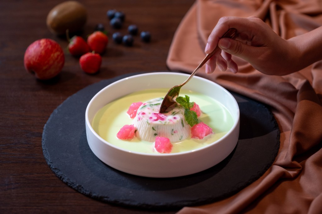 這道獨特的泰式甜點展示了濃郁而滑順的泰國椰漿布丁,甜度恰到好處,裡面綴著鮮豔的泰國甜點紅寶石(Tumtim)與鮮綠色綠豆粉條。「暹羅紅寶石布丁」(Tumtim Siam Pudding)是一個令人愉悅且清新的結尾甜點,為美好的用餐畫上完美的句點。