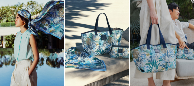 泰國探索者系列包括六款精緻旅行配件: Capri Large、Capri Medium、Cactus Medium、FIG Pouch Medium、Lotus Bag Medium 以及一款印花絲巾。每一件產品均採用頂級材料製成,兼具日常實用性與旅行便利性,適合各種生活場合。每件商品還附有小卡片,講述印花設計的靈感來源與合作故事,為旅途增添意義與情感聯繫。