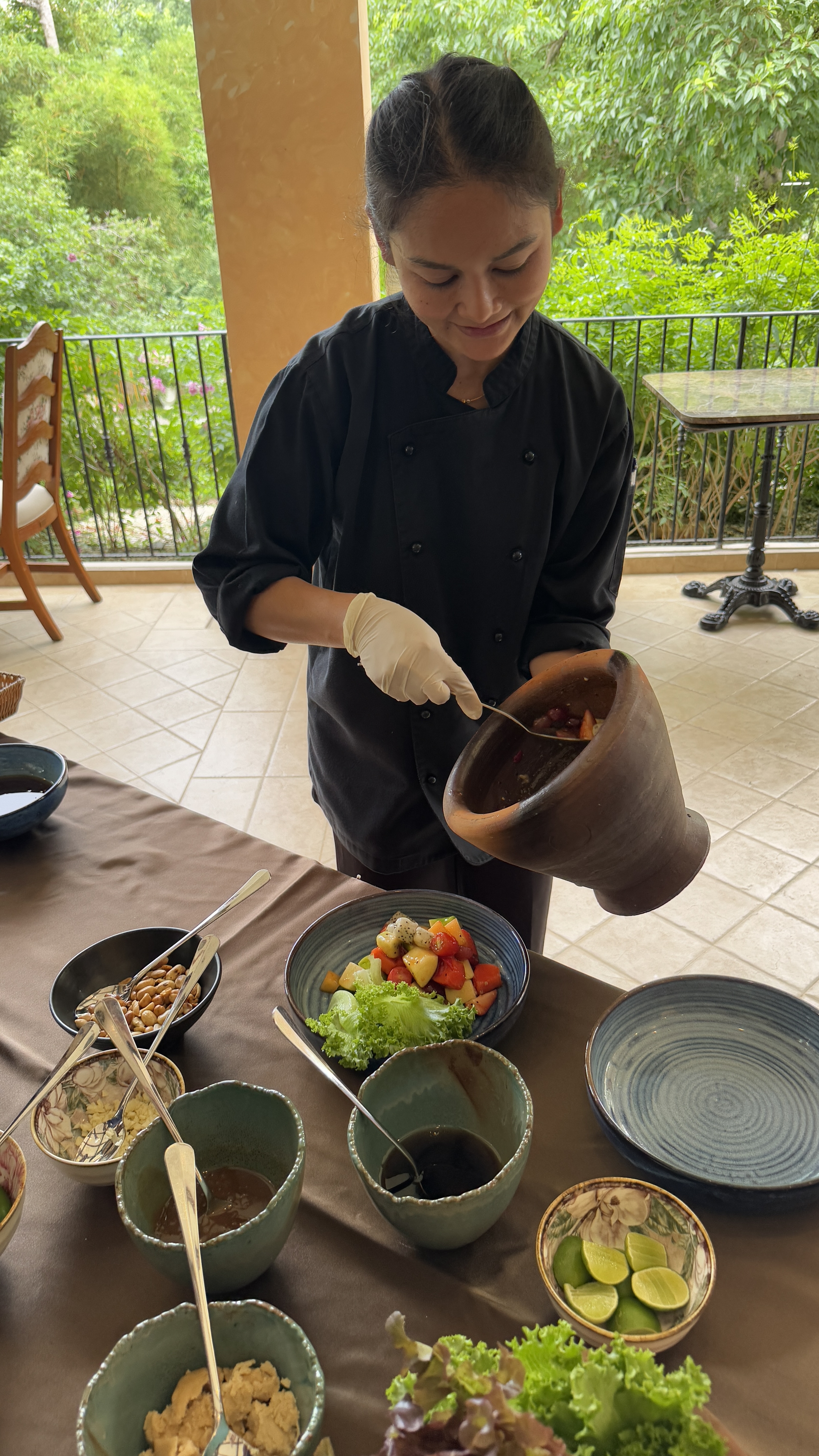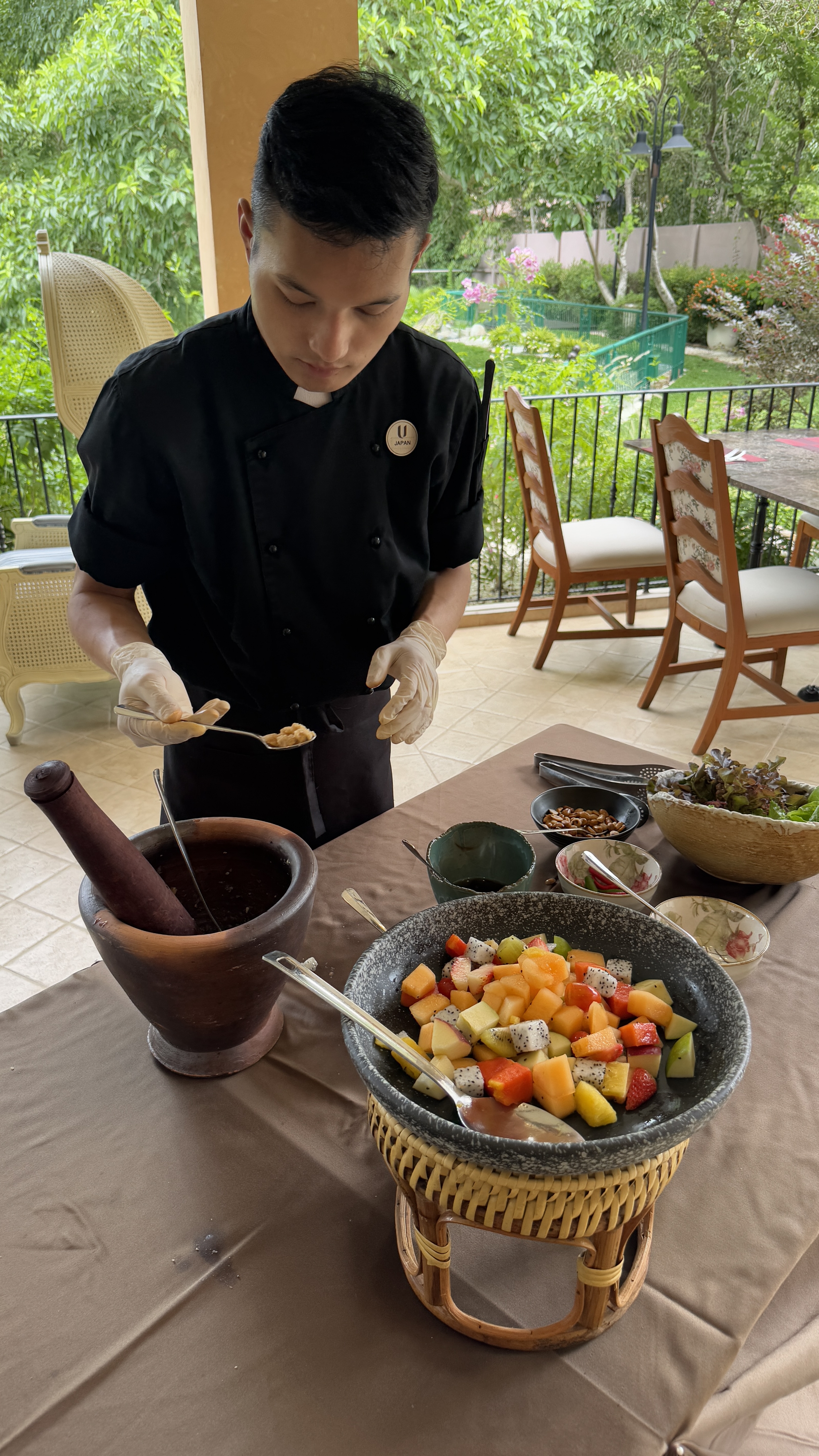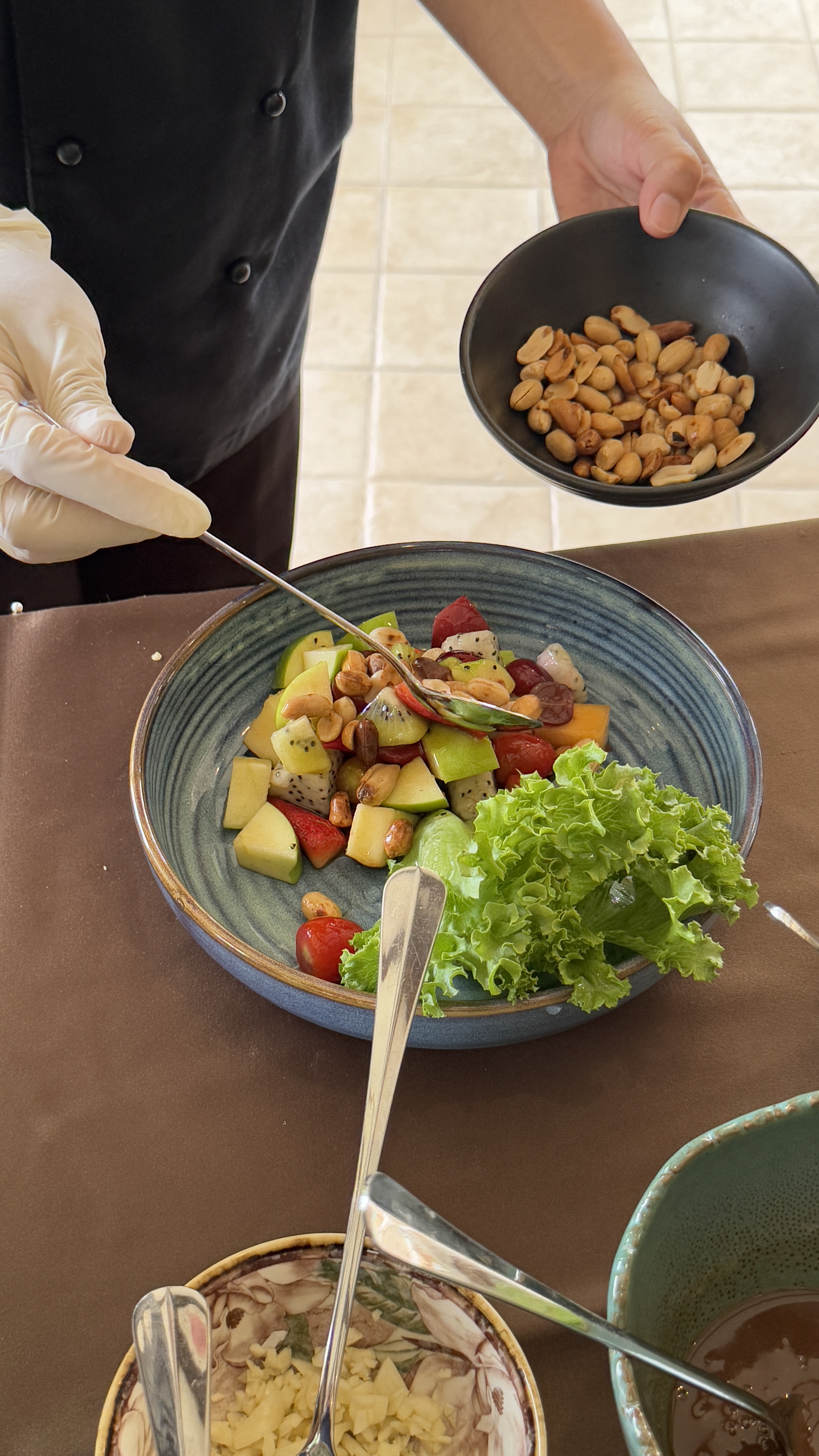 結束瑜伽後,緊接著是U Khao Yai特別安排的「泰式水果沙拉DIY」課程。你可以選擇自己喜愛的新鮮熱帶水果,搭配經典泰式酸辣醬料製作出專屬的Som Tum水果版。不只是吃進健康,還多了一份參與的樂趣。在飯店餐廳內的戶外空間一隅搭起的戶外料理檯,主廚一邊帶大家認識每一種水果的特色與功效,一邊與大家交流,是一種從味覺到心靈的溫暖互動。