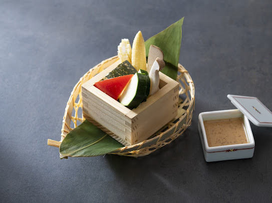 除了和牛是主角,「響板前燒肉」的配角們也不容小覷:來自澎湖的每日直送軟絲、雲林烏魚子、霧峰有機香米與台灣當令野菜,像是梨山高麗菜、埔里綠櫛瓜、雲林甜椒等,處處可見主廚對食材的用心選擇與在地支持。特別推薦的米飯選用台農71號霧峰益全有機香米,搭配主廚以蝦頭熬製的紅油與鹽蔥醬汁,入口那股淡淡芋香與Q彈甜味,讓人完全捨不得剩下任何一粒飯。