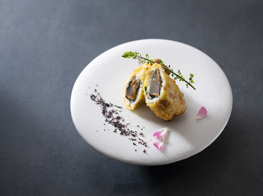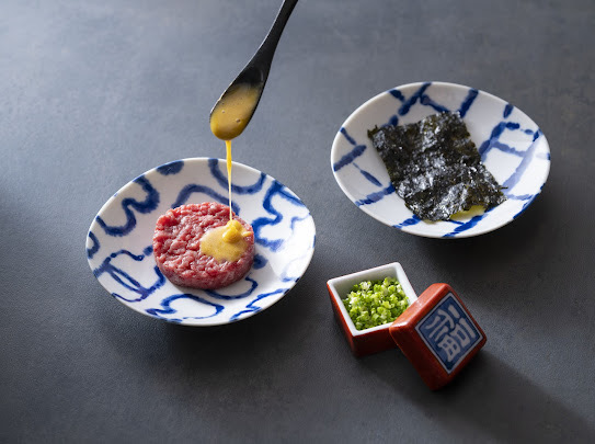 - 月見紐約客壽喜燒:人氣No.1!搭配綠藻靈芝飼養的黃金蛋黃,佐白松露醬,柔滑細膩如絲絨。