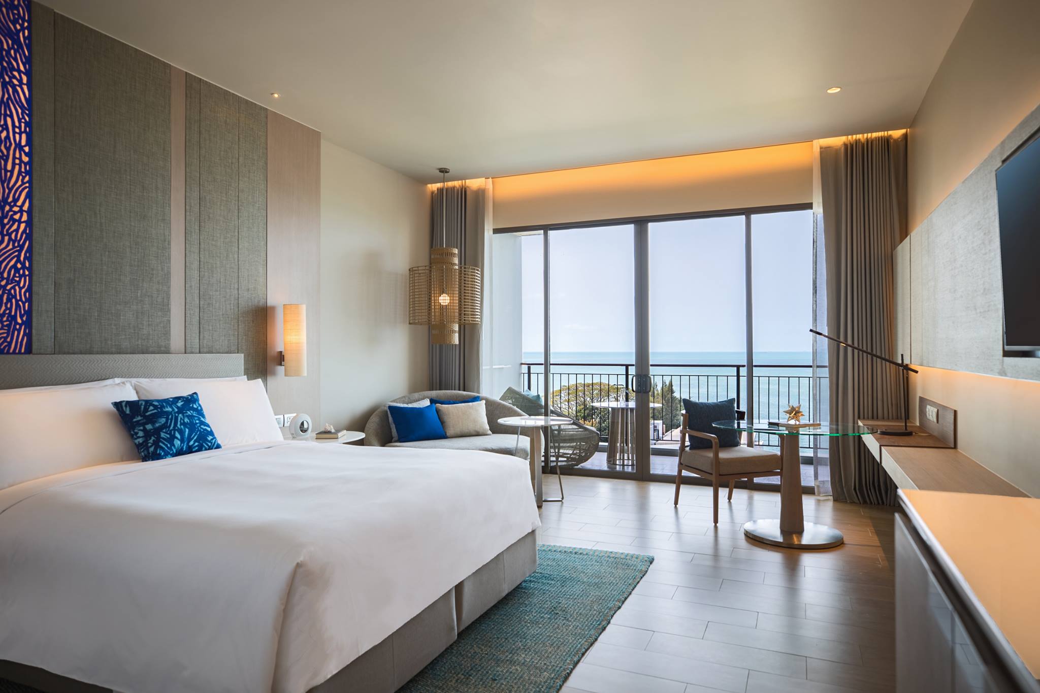 客房風格整體空間寬敞明亮,極簡設計中透著濃濃熱帶元素。大片落地窗將自然光引入室內,每個清晨醒來,望著窗外海天一色的絕美景致,就像一場靜靜展開的私人儀式。床鋪的舒適度毫不意外地延續萬豪一貫的水準,夜晚安穩好眠。