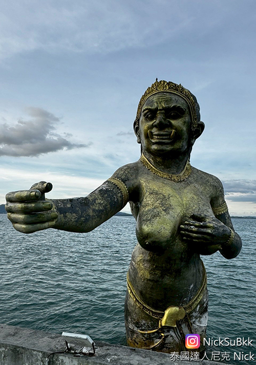一抵達沙美島的碼頭,有一座令人難以忽視的地標—海妖雕像(Statue of the Female Giant)。她靜靜佇立在港口邊,金色的身影在陽光下閃耀,彷彿仍在等待那位遠去的王子。這座雕像的靈感源自泰國著名史詩《Phra Aphai Mani》,故事講述海妖愛上王子的笛聲,為愛離開深海、追隨他的足跡,卻最終無法將他留下。於是,她化為永恆的身影,靜靜守護著這片海岸,象徵著愛與離別的永恆傳說。如今,這裡早已成為沙美島最具代表性的地標之一。